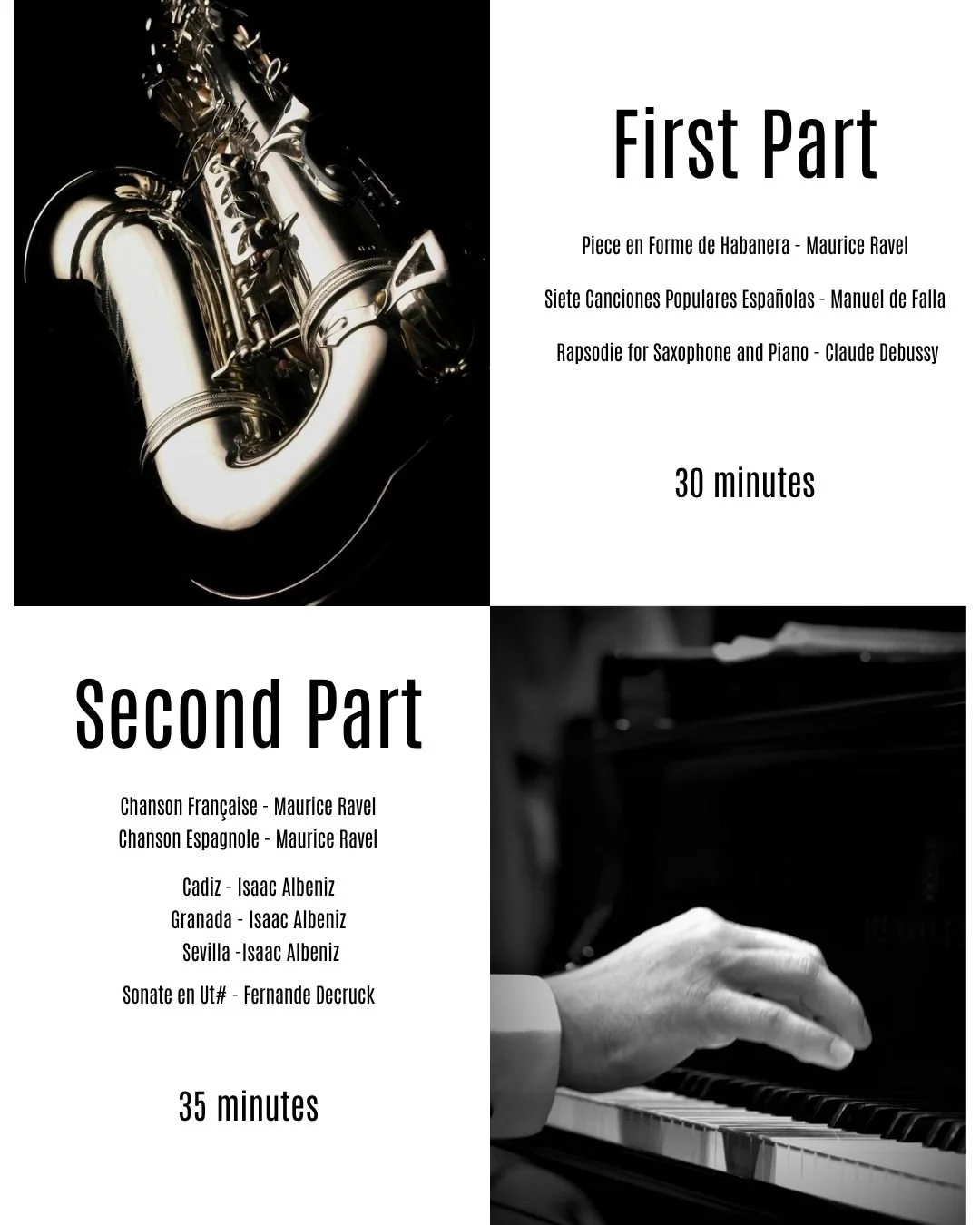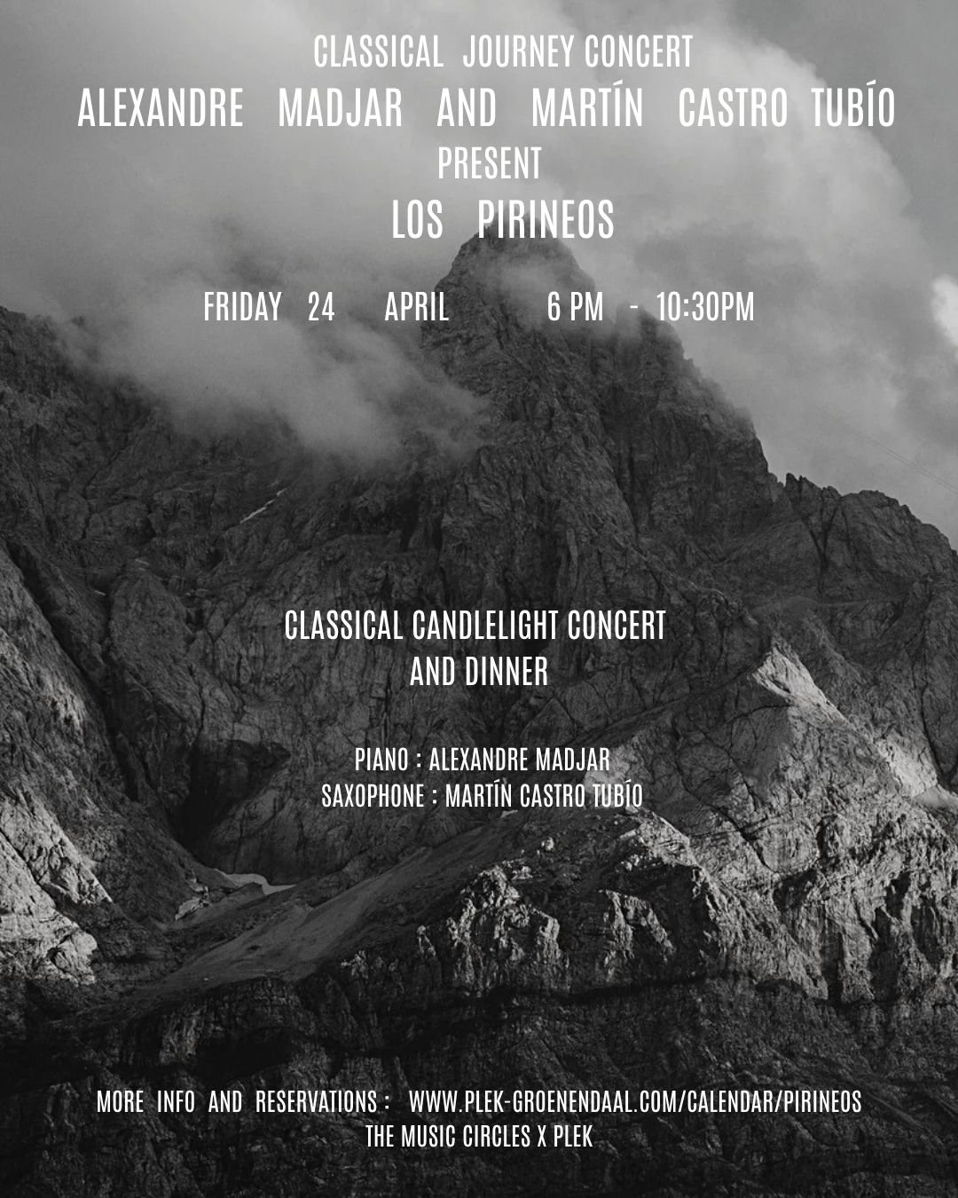 "Los Pirineos" is a mountain range that separates Spain and France. Since the two musicians come from these two countries, the program takes the audience on a journey through Spain and France, with the saxophone and the piano serving as a link. The audience sits in the middle of this magnificent mountain and hears melodies and harmonies from both sides, immersing them in both cultures.